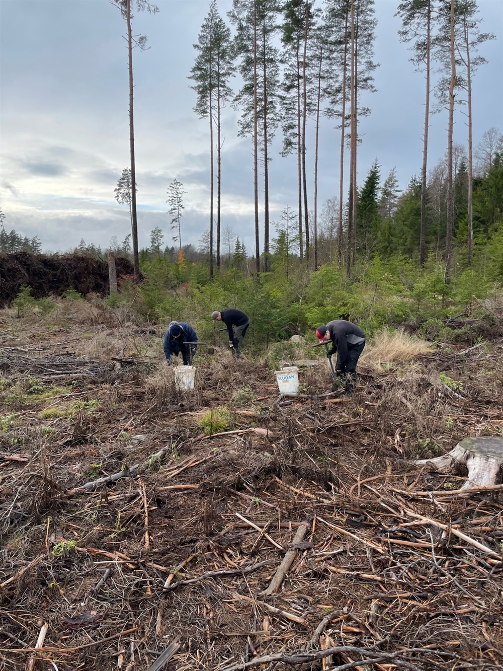 Några av våra duktiga granplanterare sätter de sista plantorna i marken.